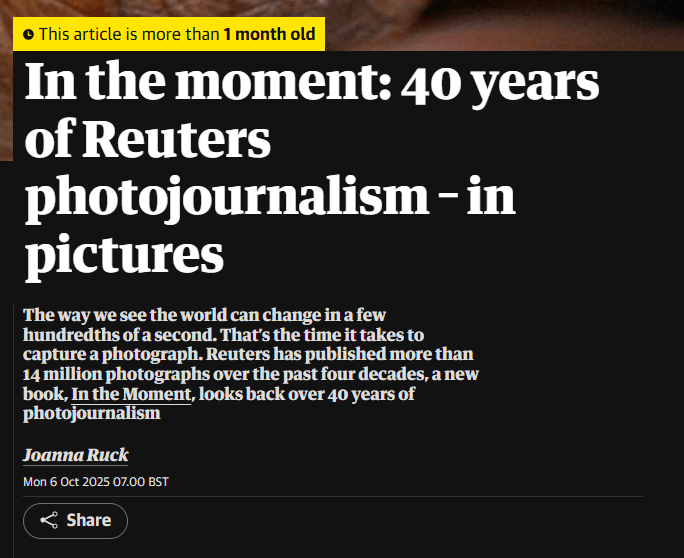 It’s promoting the release of “In The Moment”, a book recounting the last 40 years of Reuters Photojournalist.
