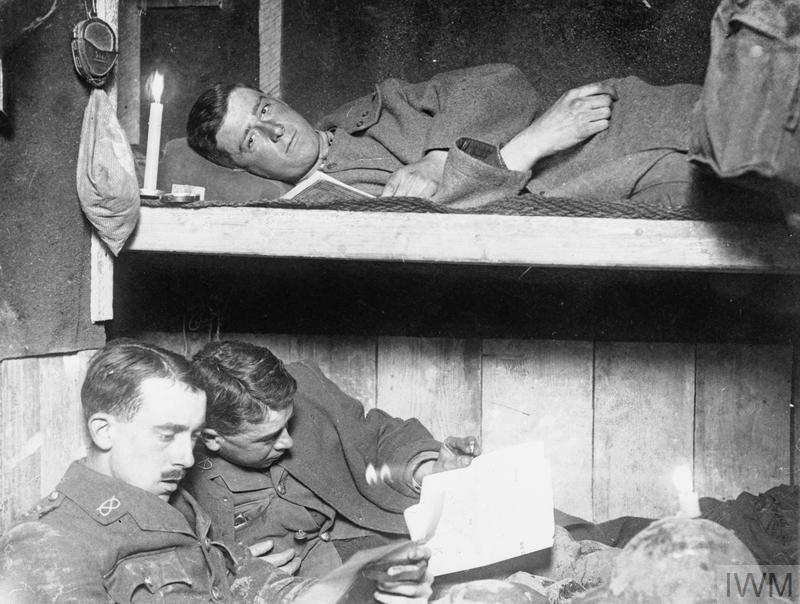 THE BATTLE OF THE SOMME, JULY-NOVEMBER 1916 (Q 1556) Officers of a battalion of the South Staffordshire Regiment study a 1:5000 scale trench map in a captured German dug-out beneath the ruined Church at Beaumont Hamel, November 1916.